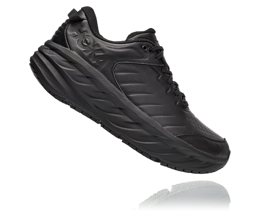 One of the first line extensions of the beloved Bondi family, the new Bondi SR takes the most cushioned shoe in the HOKA road-shoe lineup and reworks the silhouette to handle the demands of daily life. Engineered with an EVA midsole for plush, all-day cushioning, this workplace warrior has been updated with water-resistant leather and a slip-resistant outsole. Boasting a proprietary outsole compound tested against industry standards, the Bondi SR features an ultra-grippy, full ground contact rubber that stands up to the demands of the service industry and medical field alike.